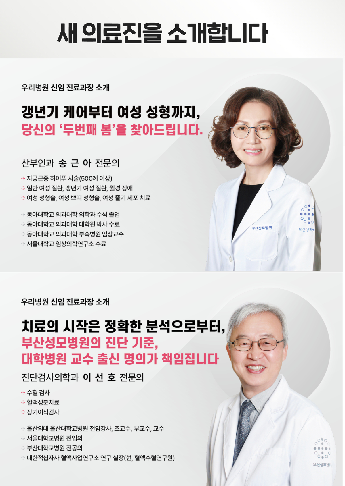 공지사항 내용보기 작성일 2026-01-30 오전 10:29:35 제 목 2026년 2월 새 의료진을 소개합니다. 첨부파일 제목을 입력하세요 (1).jpg 2026년 2월부터 진료를 시작하시는 산부인과 송근아 과장님과 진단검사의학과 이선호 과장님을 소개합니다. 목록