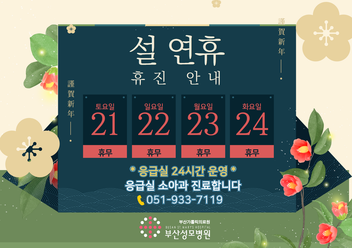 공지사항 피부과 미운영 안내 2023-01-26 관리자 2023년 설 연휴 응급실 24시간 운영/소아과 진료시간 안내 2023-01-09 관리자 2023년 설 연휴 휴진 안내 2023-01-06 관리자 부산성모병원, 차세대 통합차세대 통합의료정보시스템 구축 2022-11-25 관리자 10월 오전 진료 안내 2022-09-13 관리자 추석연휴 휴진 안내 2022-09-01 관리자 9 | 10 | 11 | 12 | 13 | 14 | 15 | 16 제목 작성자 내용