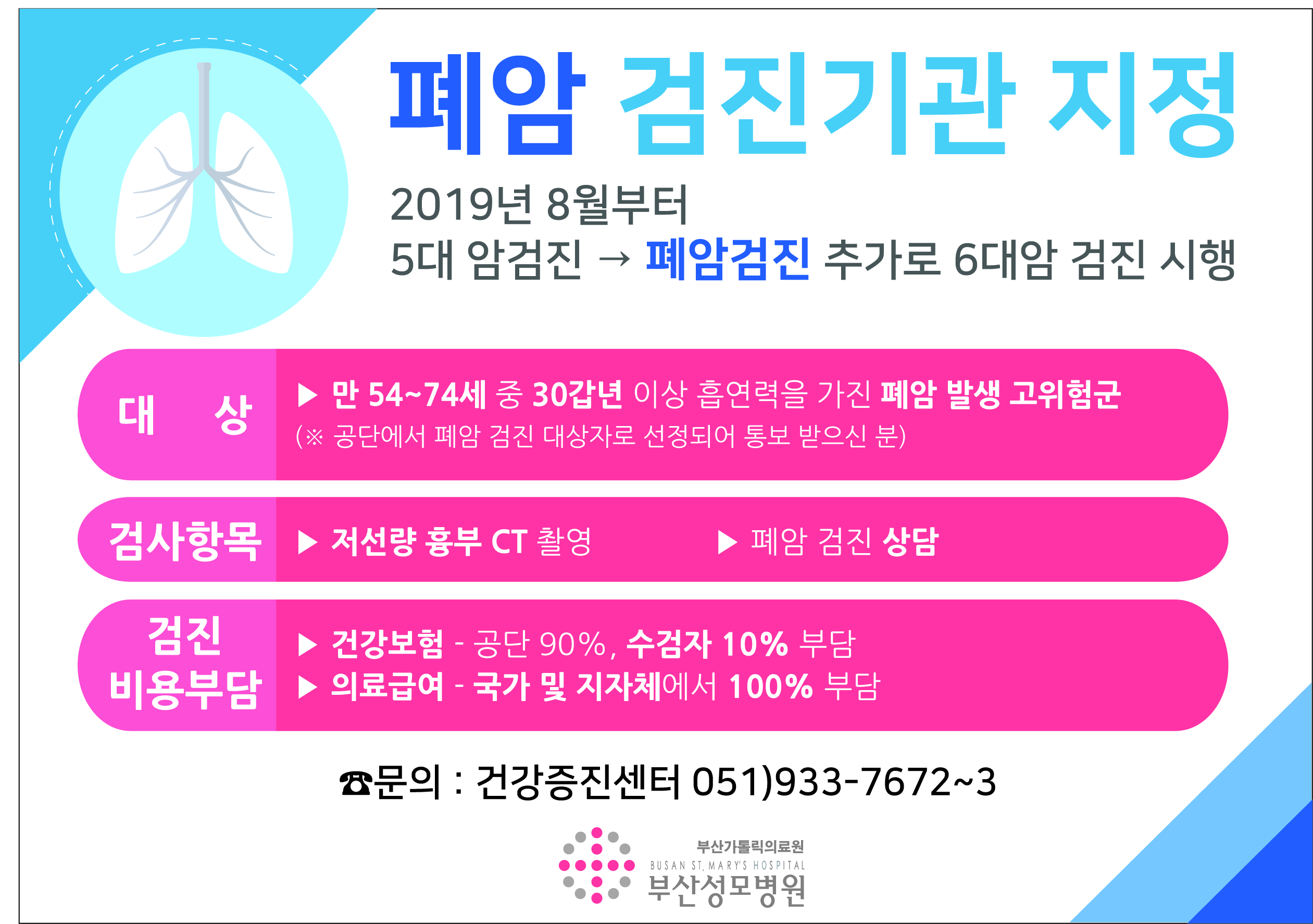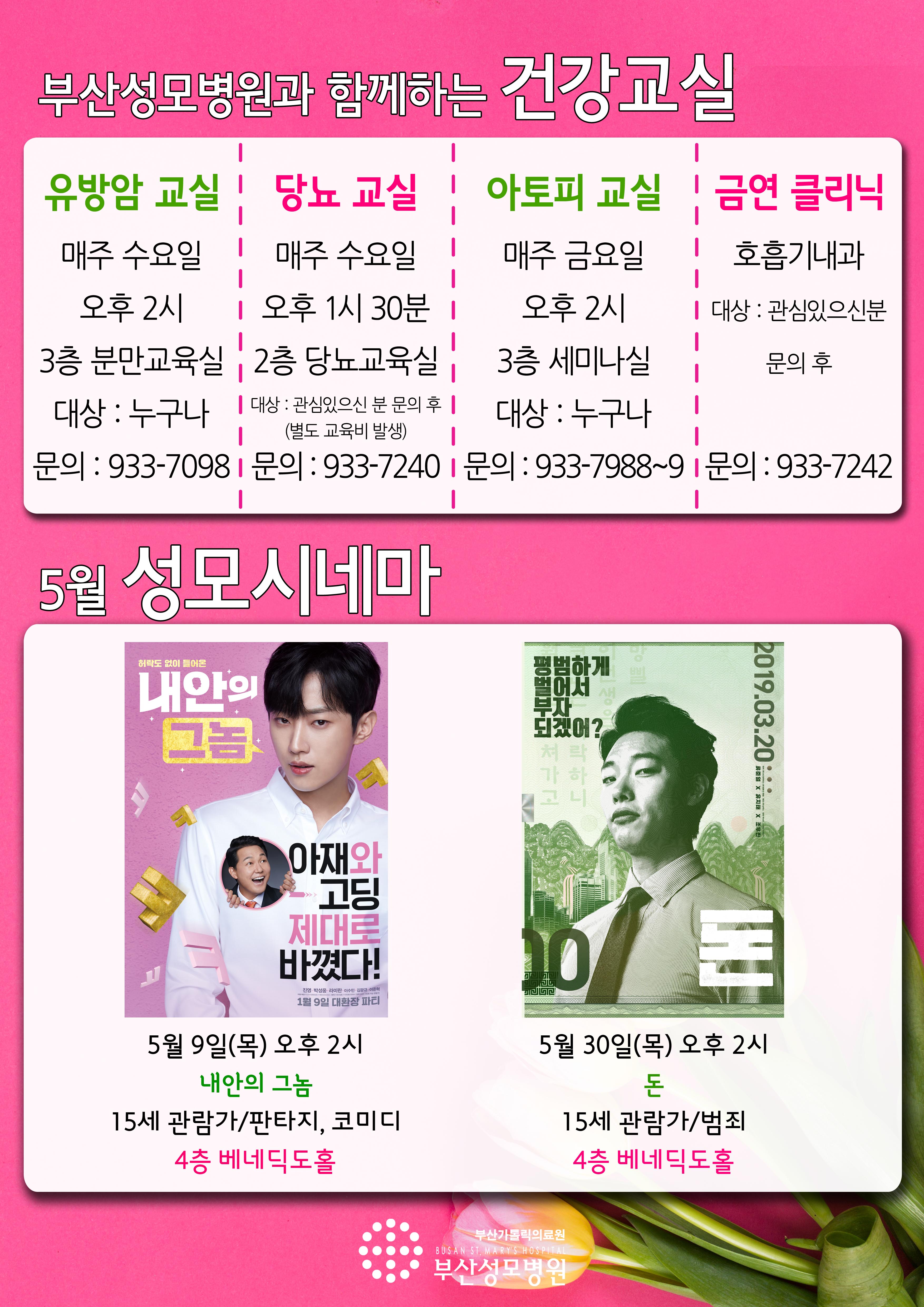 공지사항 2019년 추석 연휴 진료 안내 2019-09-09 관리자. 부산성모병원 가정형호스피스 안내 2019-08-09 관리자. 폐암 검진기관 지정(기존 5대암 + 폐암) 2019-07-24 관리자. 2019년 7월 건강교실 및 성모시네마 상영 안내 2019-06-28 관리자. 2019년 6월 건강교실 및 성모시네마 상영 안내 2019-05-30 관리자. 2019년 5월 건강교실 및 성모시네마 상영 안내 2019-04-30 관리자. 17 | 18 | 19 | 20 | 21 | 22 | 23 | 24 제목 작성자 내용