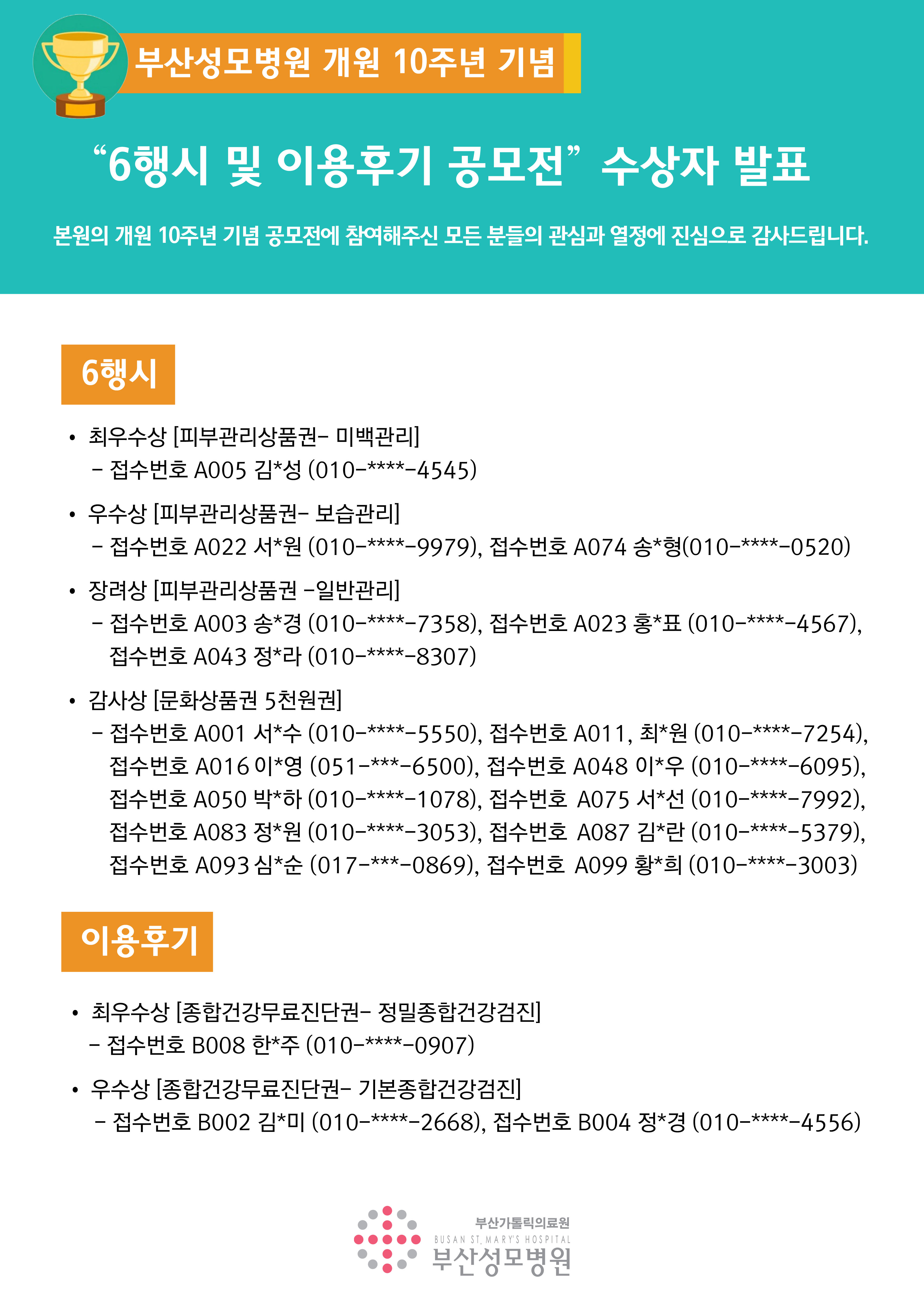 공지사항 부산성모병원 2016년 12월 건강교실 및 성모시네마 안내 2016-12-06 관리자 14세 미만 아이핀 가입 방법 2016-11-23 관리자 부산성모병원 2016년 11월 건강교실 및 성모시네마 안내 2016-11-02 관리자 부산성모병원 2016년 10월 건강교실 및 성모시네마 안내 2016-09-30 관리자 부산성모병원 2016년 9월 건강교실 및 성모시네마 안내 2016-09-02 관리자 “6행시 및 이용후기 공모전” 수상자 발표 2016-08-24 관리자 25 | 26 | 27 | 28 | 29 | 30 | 31 | 32 제목 작성자 내용