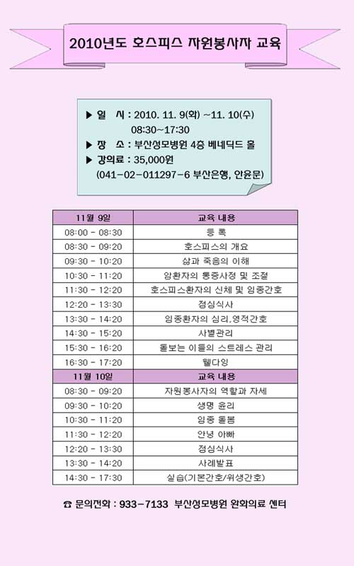 공지사항 2011년 신규간호사 채용 서류 합격자 발표 2010-11-17 관리자 피부 재생 및 주름에 효과 좋은 프락셔널 레이저 도입 2010-11-08 관리자 2010 호스피스 자원봉사자 교육 안내 2010-10-27 관리자 강박증 임상시험 피험자 모집 2010-10-26 관리자 무료 웃음특강 안내 -웃으면 복이와요^^- 2010-10-16 관리자 2010완화의료 캠페인 주간 행사안내 2010-10-08 관리자 41 | 42 | 43 | 44 | 45 | 46 | 47 | 48 제목 작성자 내용
