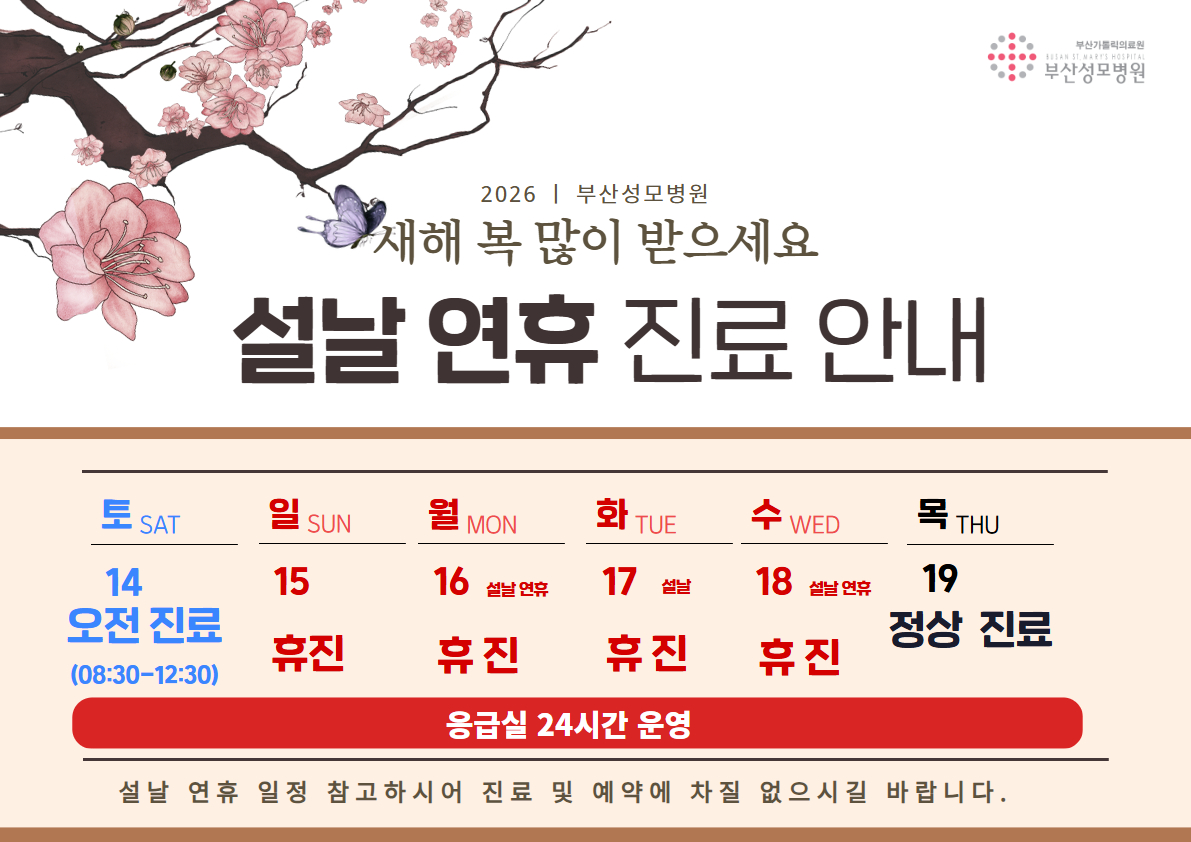 공지사항 내용보기 작성일 2026-02-13 오전 11:50:27 제 목 설 연휴 진료 안내 첨부파일 설연휴 진료안내.jpg 새해 복 많이 받으세요~ 부산성모병원 설 연휴 진료 안내입니다. 감사합니다. 목록