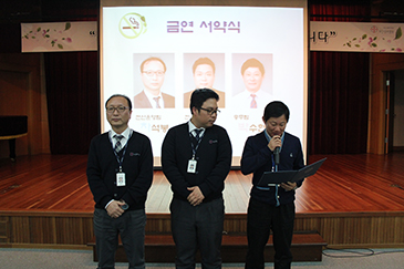 한편 이번 시무식에서는 작년에 이어, 금연 서약식을 진행하였으며, 신년떡 절단식과 함께 올해 슬로건 <부산성모병원은 희망을 함께합니다>를 제창하며 2017년의 힘찬 각오를 다지는 시간을 가졌다.