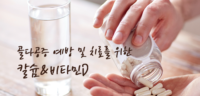 골다공증의 예방과 치료를 위해 적절한 칼슘과 비타민 D 영양상태를 유지하는 것은 필수적입니다. 칼슘과 비타민 D는 골다공증의 예방과 치료에 사용되는 다른 약제와 함께 기본적으로 투여되어야 합니다. 칼슘 섭취량에 따라 최대 골량이 5-10% 변화 하고, 칼슘과 비타민 D를 충분히 복용하면 골밀도가 증가하고 골절이 감소합니다. 이러한 효과는 칼슘과 비타민 D를 꾸준하게 복용한 경우에만 나타납니다.